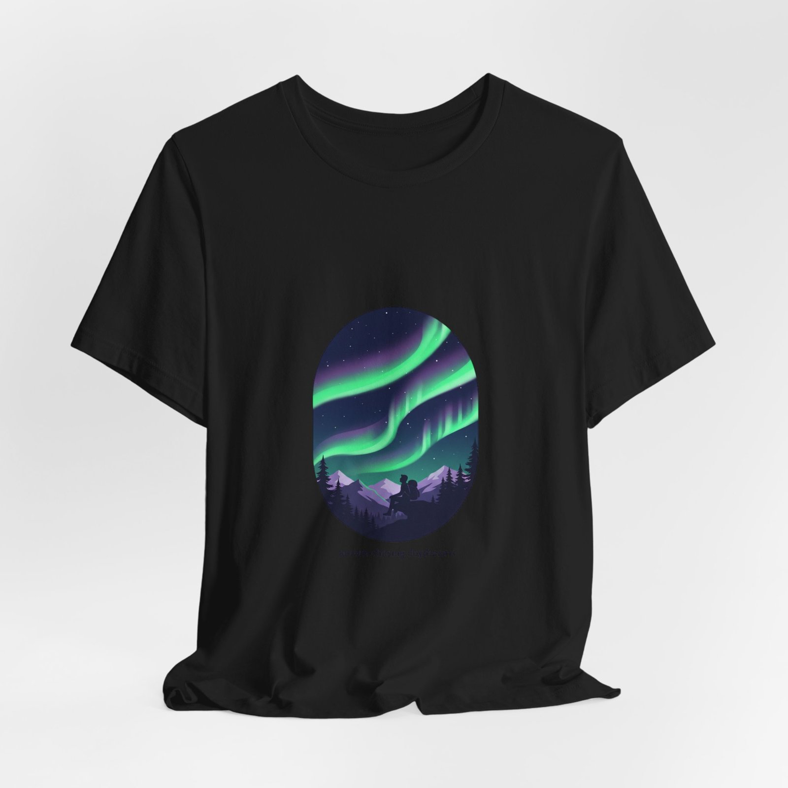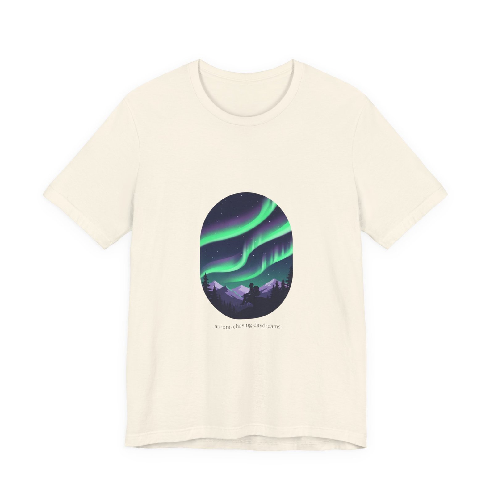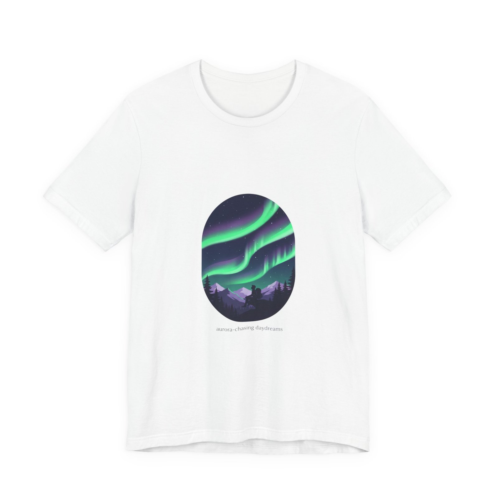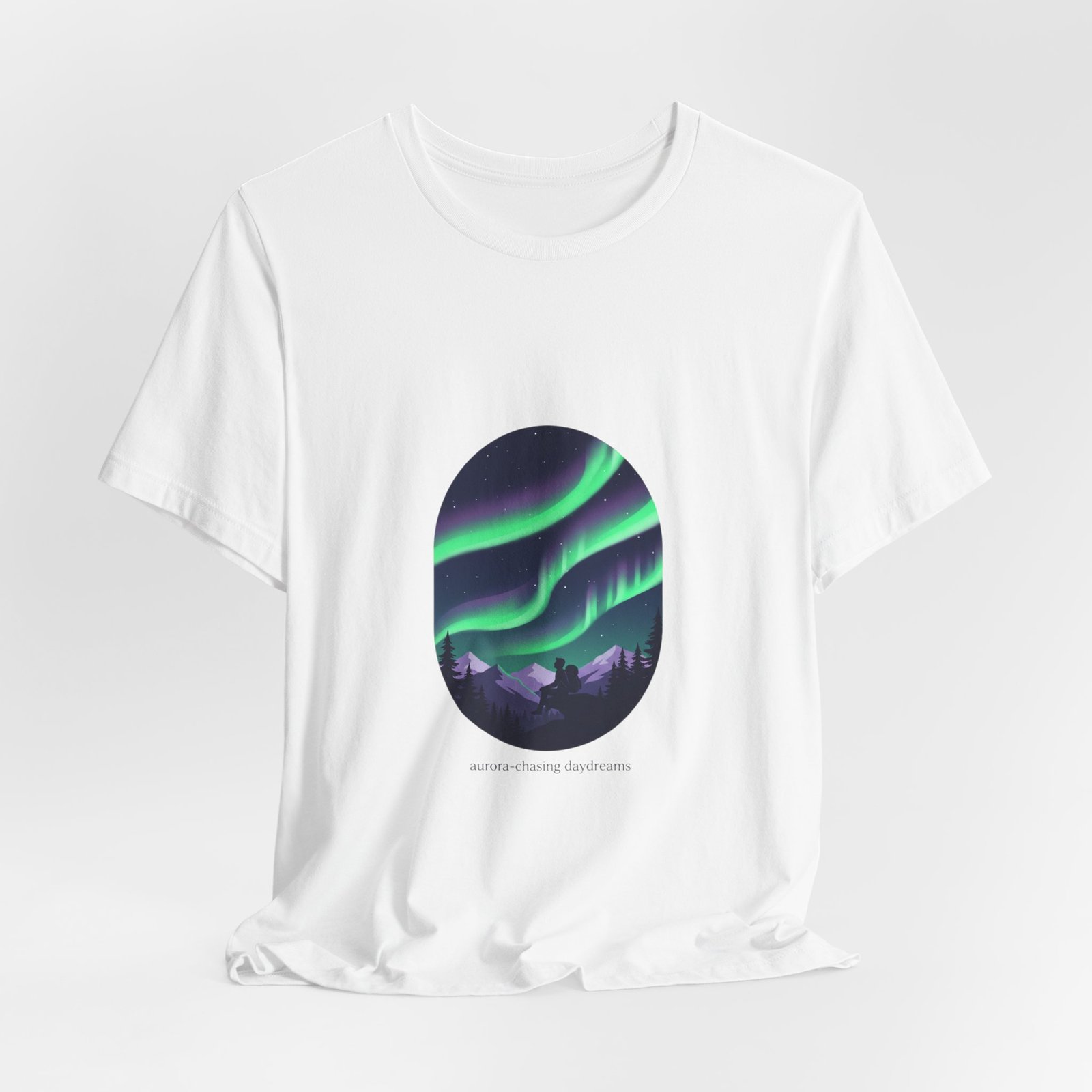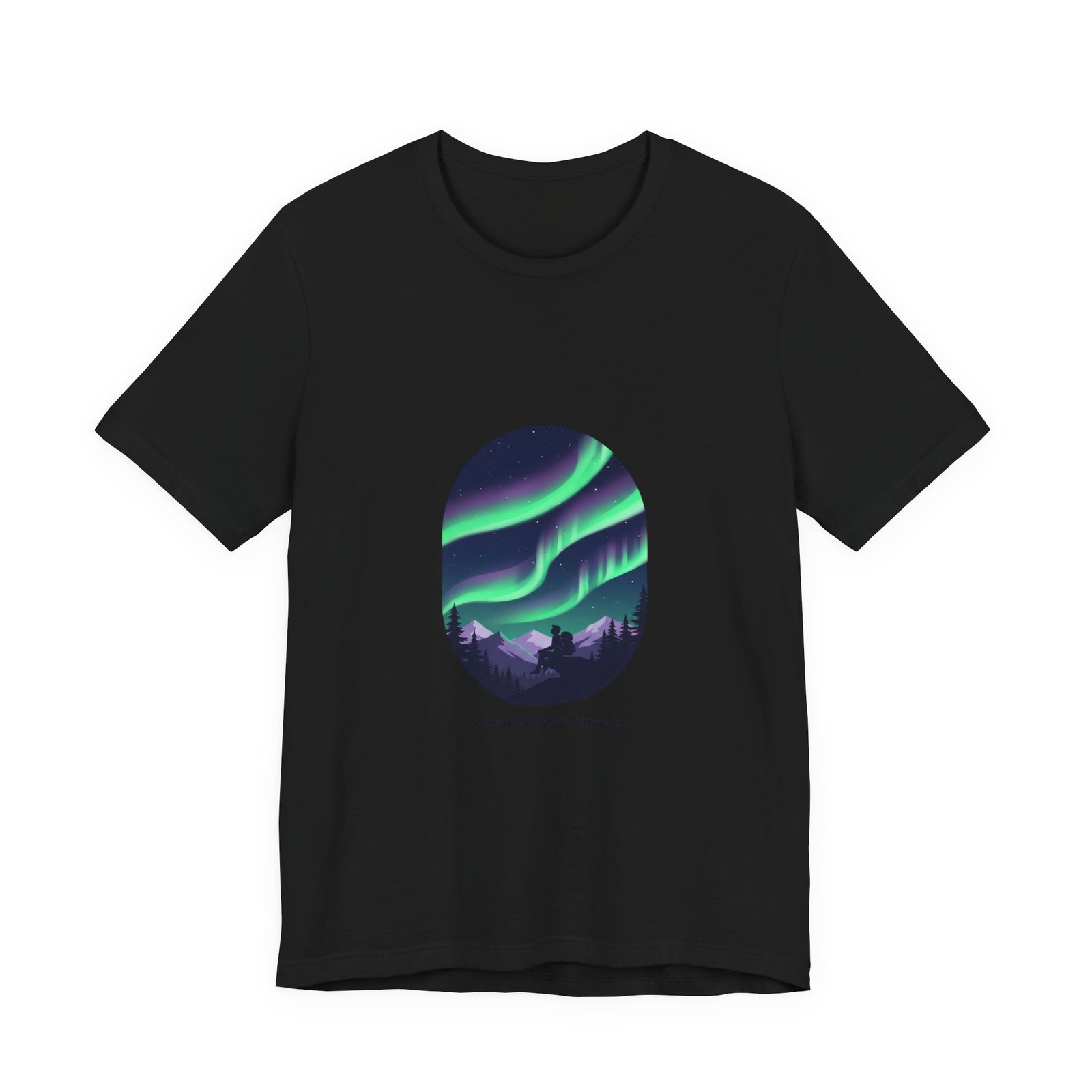 A serene aurora tee capturing a minimalist night-sky scene: layered neon-green and purple ribbons of northern lights arcing above a silhouetted treeline in an oval frame. The artwork reads as quiet wanderlust—designed for stargazing-minded shoppers who want wearable aurora art that pairs with neutral layers and travel-ready wardrobes. Clean sans lettering and deep-sky tones align with the Aurora-Chasing Daydreams trend without referencing specific events or names.