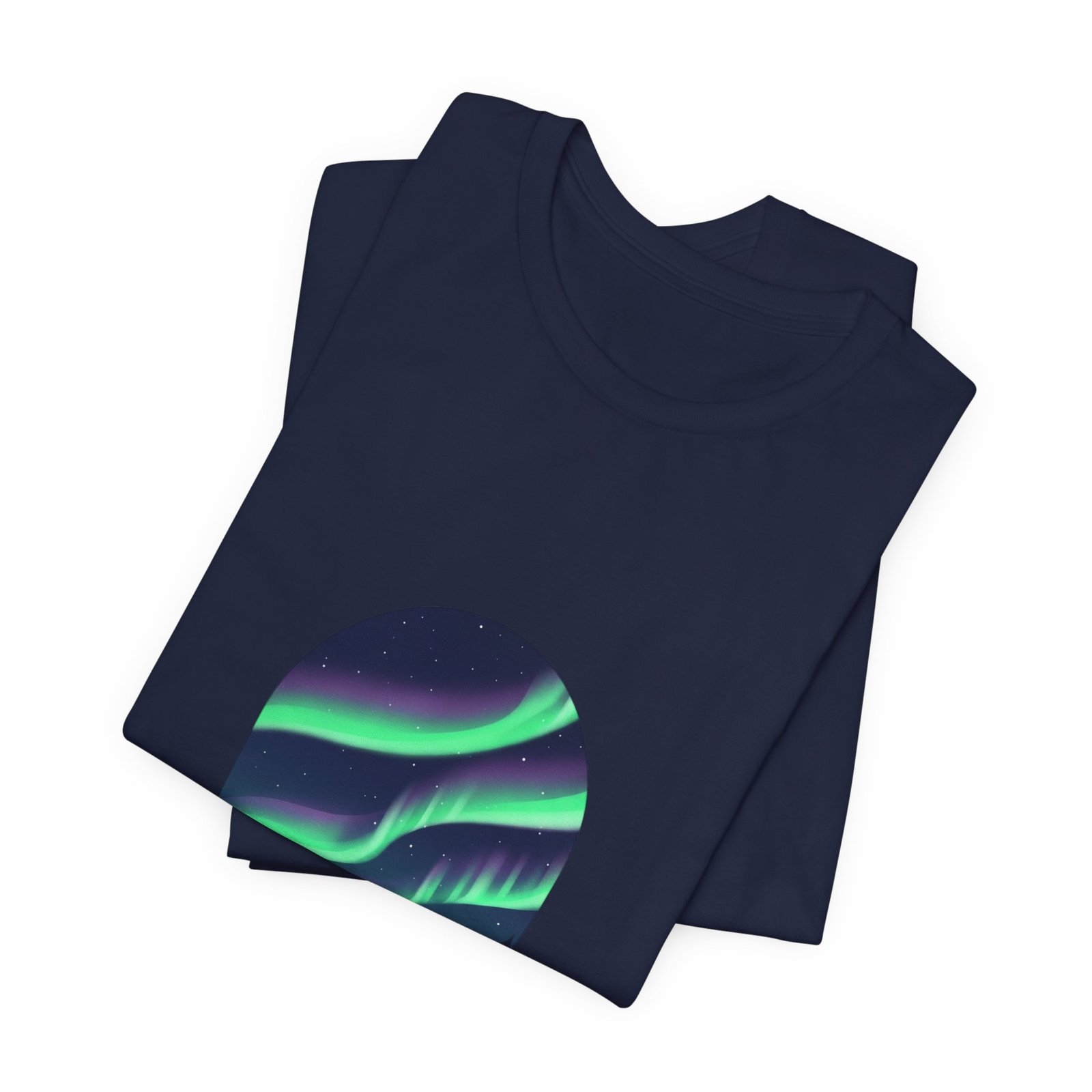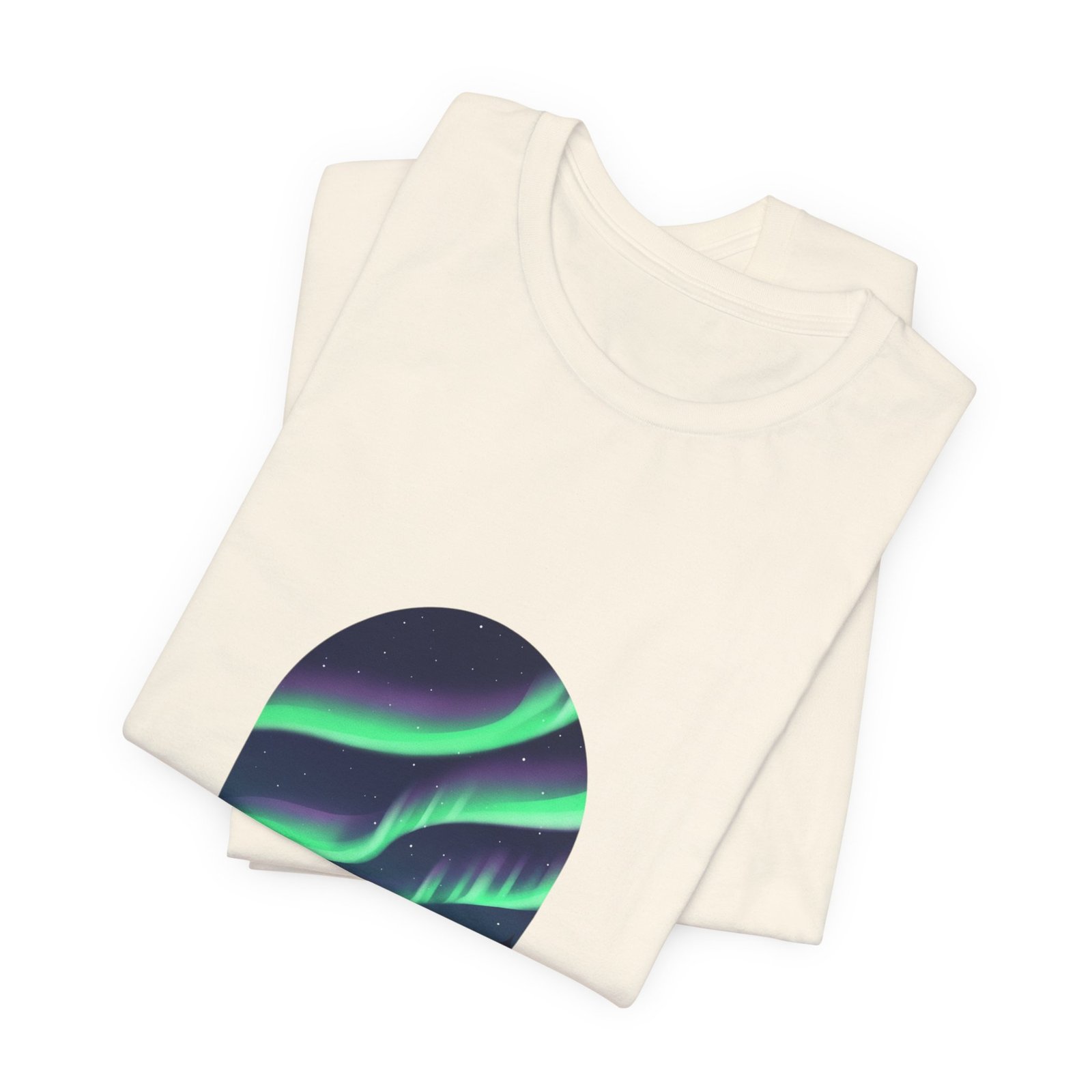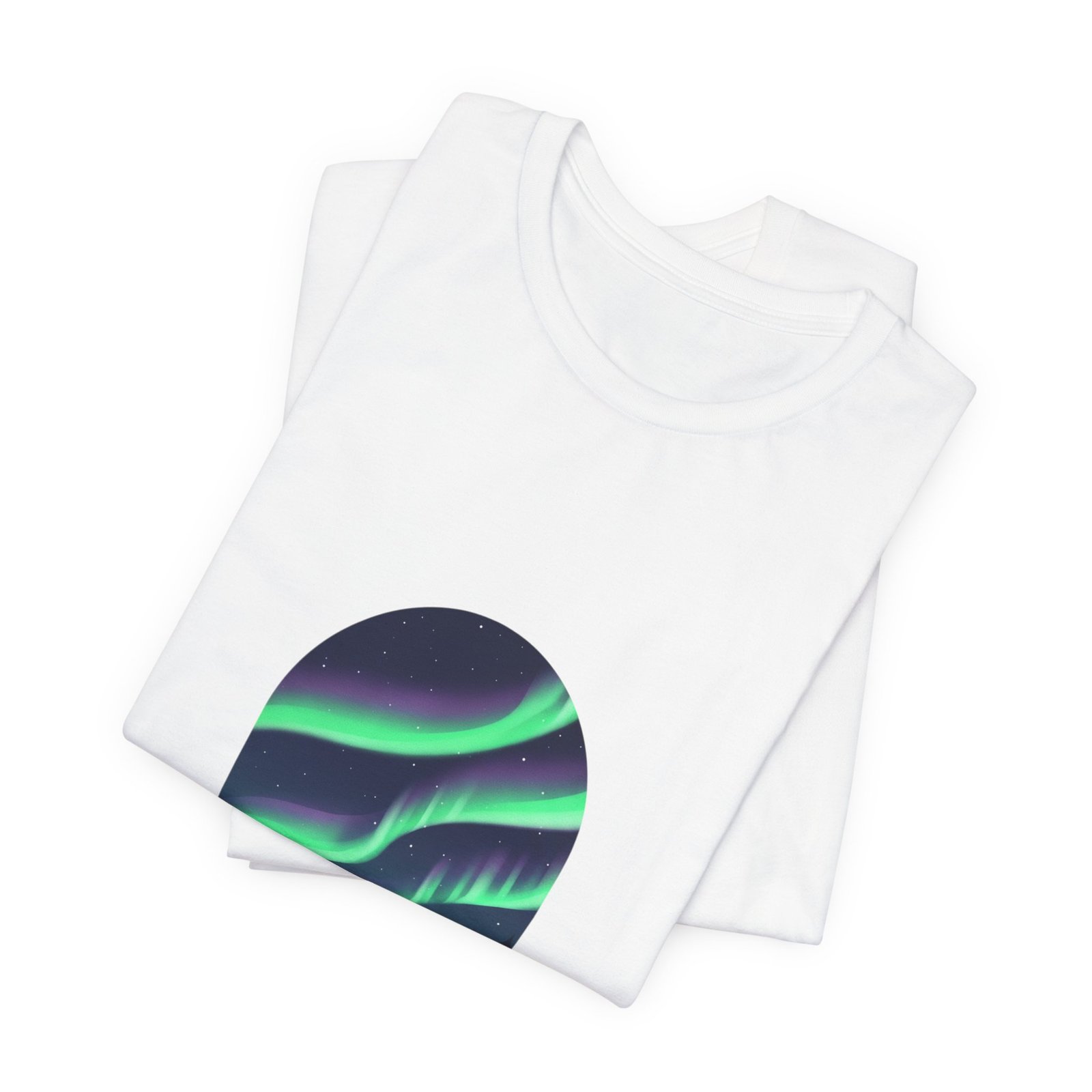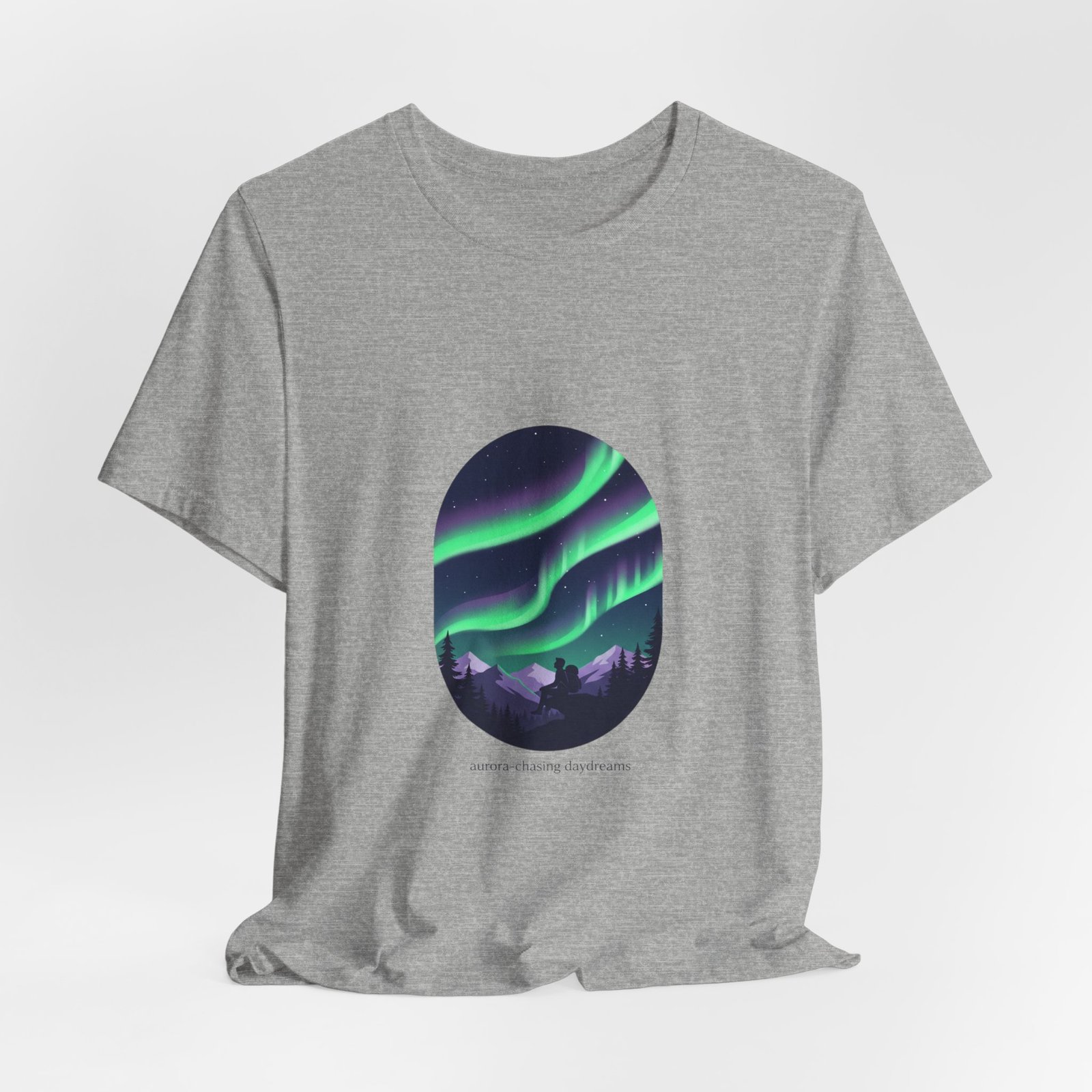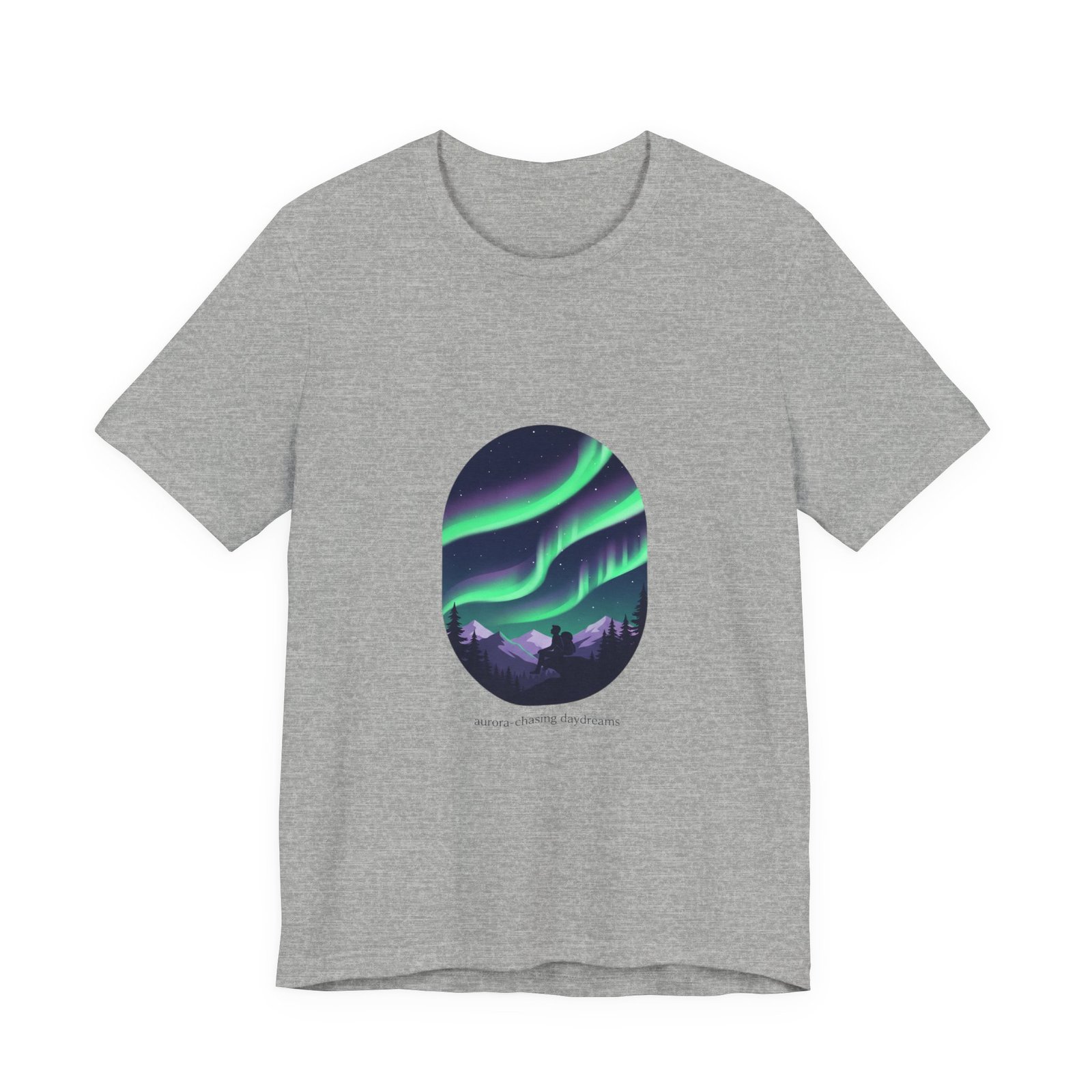 A serene aurora tee capturing a minimalist night-sky scene: layered neon-green and purple ribbons of northern lights arcing above a silhouetted treeline in an oval frame. The artwork reads as quiet wanderlust—designed for stargazing-minded shoppers who want wearable aurora art that pairs with neutral layers and travel-ready wardrobes. Clean sans lettering and deep-sky tones align with the Aurora-Chasing Daydreams trend without referencing specific events or names.